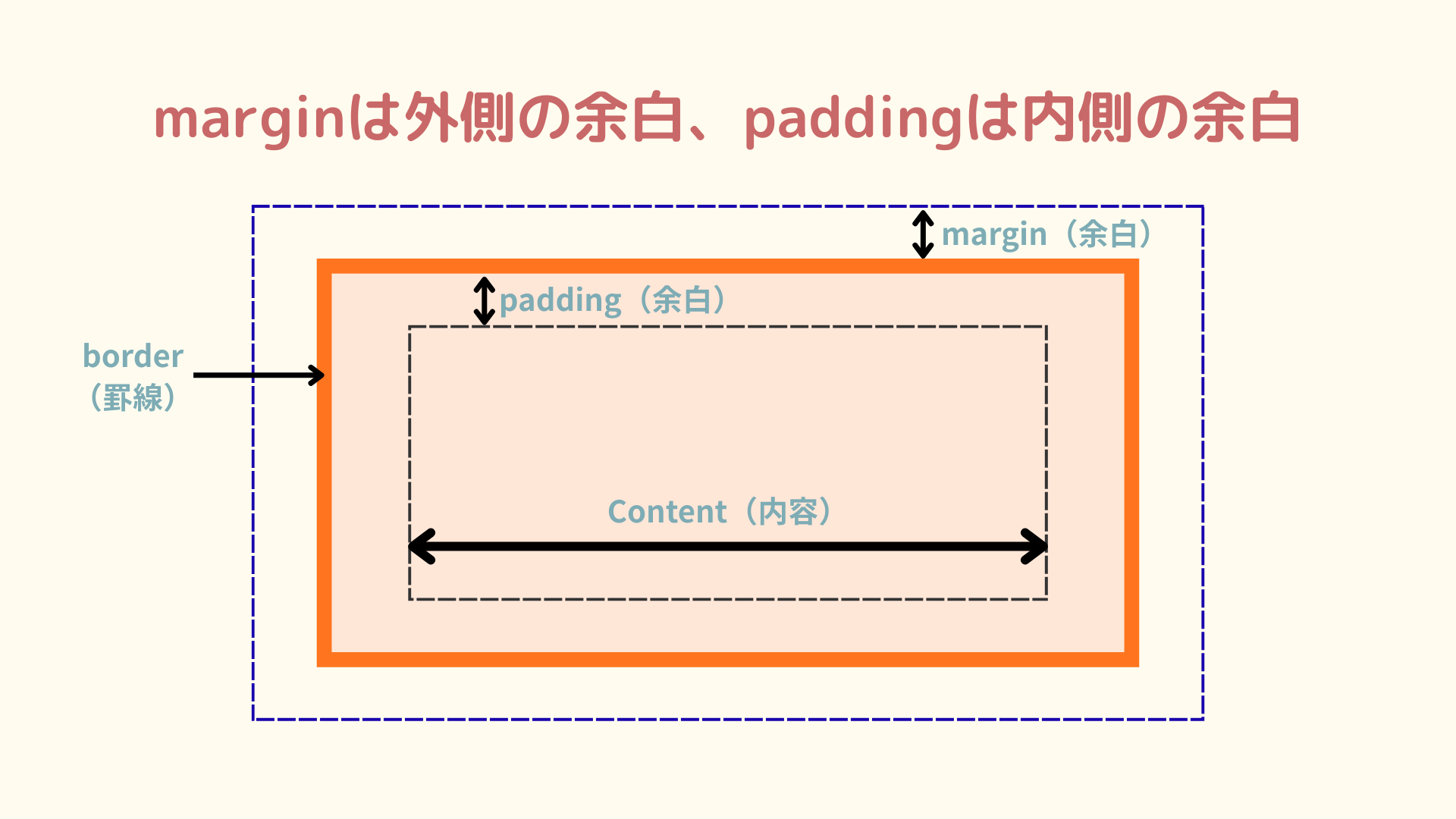 - Margin(マージン):枠線のさらに外側にある「外側の余白」。