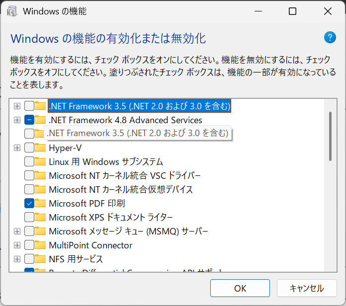 この状態で「Windowsの機能の有効化または無効化」から .NET Framework 3.5 をインストールします。今度はエラーが出ずに進行するはずです。