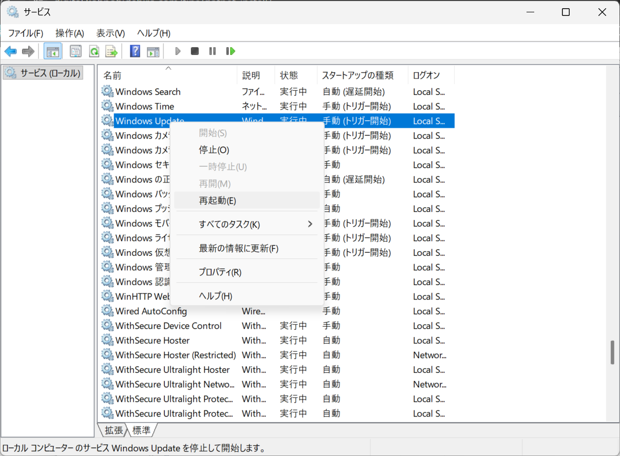- Windows Updateサービスを右クリックし、「再起動」を選択。